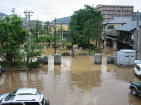 7月18日未明にはものすごい雨で目が覚めました。外を見ると下水の水が溢れています。嫌な予感がしましたが、10時頃には雨も上がって晴れてきました。秀樹くんの実家(目と鼻の先ですが)冠水していないか心配で、見に行きました。案の定、一面水浸しで、4人がかりで車庫に貯まった水を掻き出しました。