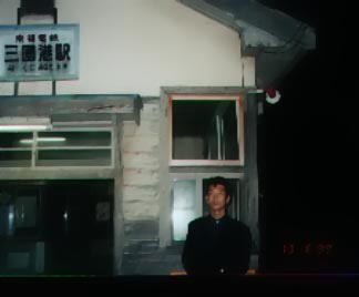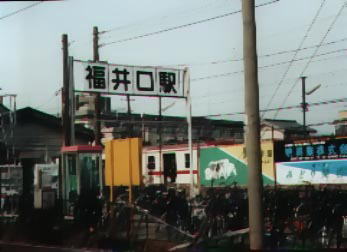 | 福井口駅(平成13年11月撮影) 駅舎はひっそりとしています。 左中央に少し高架の橋桁を見るこ とができます。 |