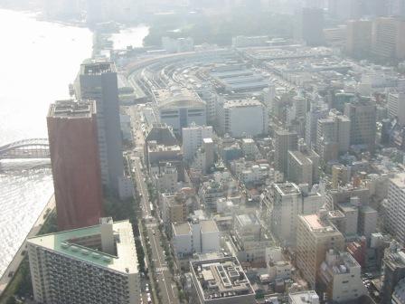 聖路加病院の展望台からも築地市場が一望できます。どこのビルだったでしょうか。断面が三角というビルは特徴があります。市場も豊洲方面への移転問題を抱えています。