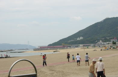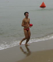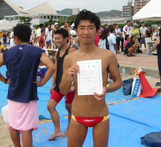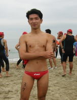 | トータル1時間5分でごーる。ラン10Kが41分(これって本当に10Kあったのかな?)ぐらいの計算になります。今回は2回目とあって余裕をもって泳げたし、走れたかなあと思います。表彰状ではありません。パンフレットに同封の完走証です。(写真左) 須磨海水浴場は源氏物語の舞台にもなったところかな。のんびりした感じの大マリン・リゾートです。明石では海岸線の陥没が報道されましたが、ここは大丈夫なのかな。ブイの向こう側は潮の流れが速いのでしょう。 9月とはいえ日差しが強く、暑い日になりました。お気に入りのパンツもちょっとくたびれ気味。スイムの遅い「LIFE GUARD」は「似非ライフガード」で、ご当地のガード連中に見つかったら殴られるでしょう(写真右)。 |