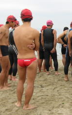 | 赤で決め込んでみましたが、海水は冷たく、ウエットスーツが羨ましくなり心配そうな表情をしています(中央)。さて、750m泳いだ後(右)はかなり疲れています。この後雨の中をラン5Kが待っています。・・・どうにか制限時間内でゴールインしました。 | ||
